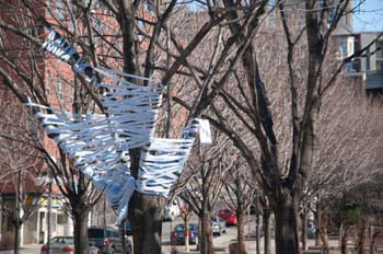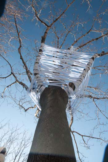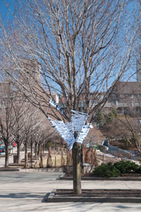 En 2010, la Maison des métiers d'art de Québec a organisé une exposition dans le Parc St-Roch, invitant les artistes à réaliser une installation en prenant en compte la fragilité des arbres particulièrement vulnérables à cette période de l'année. La proposition réalisée s'intitule ZIP!, est composée uniquement de fermetures à glissière, et utilisées comme métaphore au rythme de ma vie à cette période. L'invention de la fermeture à glissière proposait une économie de temps comparativement à la boutonnière. En un éclair une veste ou une braguette se fermait! En même temps, j'ai saisi l'occasion de faire ressortir les volumes triangulaires présents dans l'érable qui accueillait cette installation.
