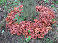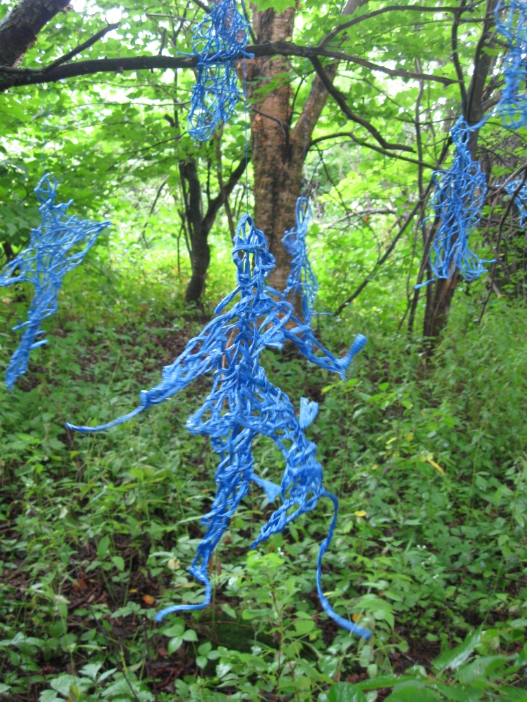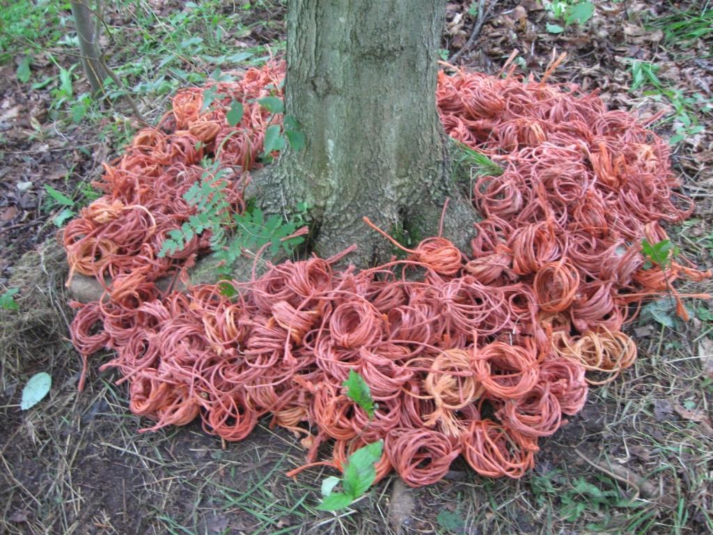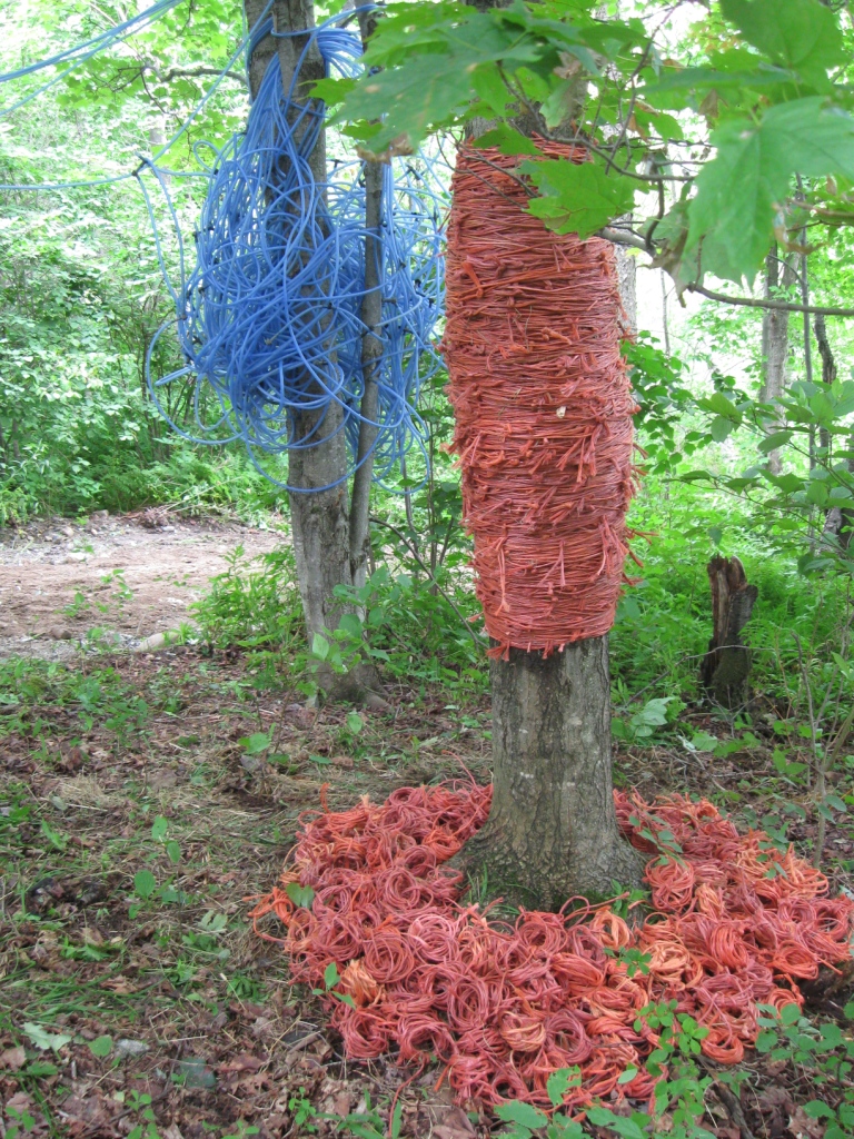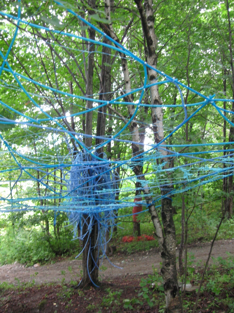 De la tubulure désuète pour l'acériculture et une grande quantité de corde usagée en polypropylène m'ont été donnés pour réaliser cette installation en forêt. Le temps d'un après-midi pluvieux, des gens du voisinage sont venus m'aider à mettre en forme ces matériaux-rebuts issus de la campagne, à l'aide de techniques empruntées aux arts textiles. Le tissu social en ruralité peut être à la fois serré ou distant, solidaire ou ostracisant: j'ai choisi d'appuyer le projet sur les concepts de don, de collaboration et de relation d'entraide entre les individus.