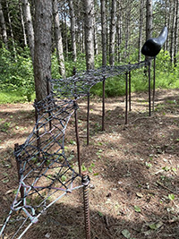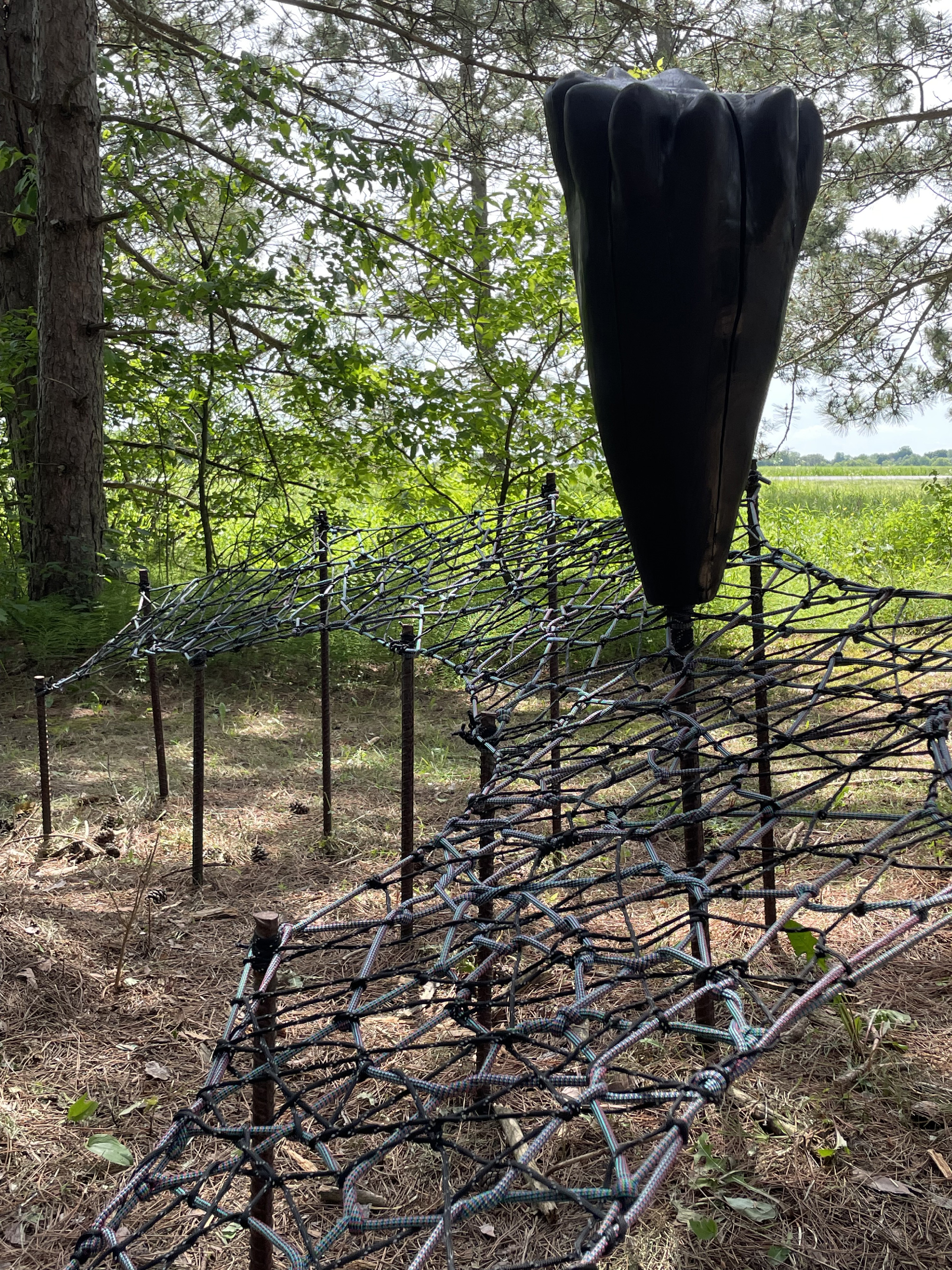 En nature, une foule de relations d'entraide, de soutien et d'échanges existent même entre différentes espèces. Ces réseaux, parfois à l'échelle des micros organismes, je souhaitais les rendre visibles dans mon installation en forêt. Trois îlots présentant chacun un réseau imagé par des entrelacement de bandes de caoutchouc reçoivent chacun une forme sculptée en bois. Les trois sculptures sont inspirées de la fleur d'une plante qui pousse en abondance sur le site, l'impatiente du cap.