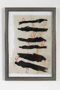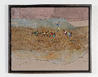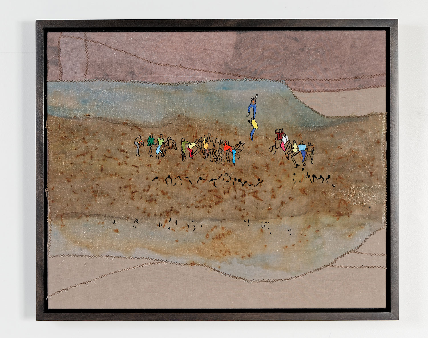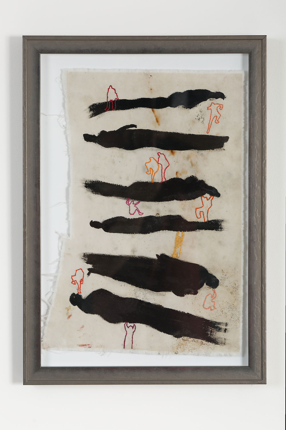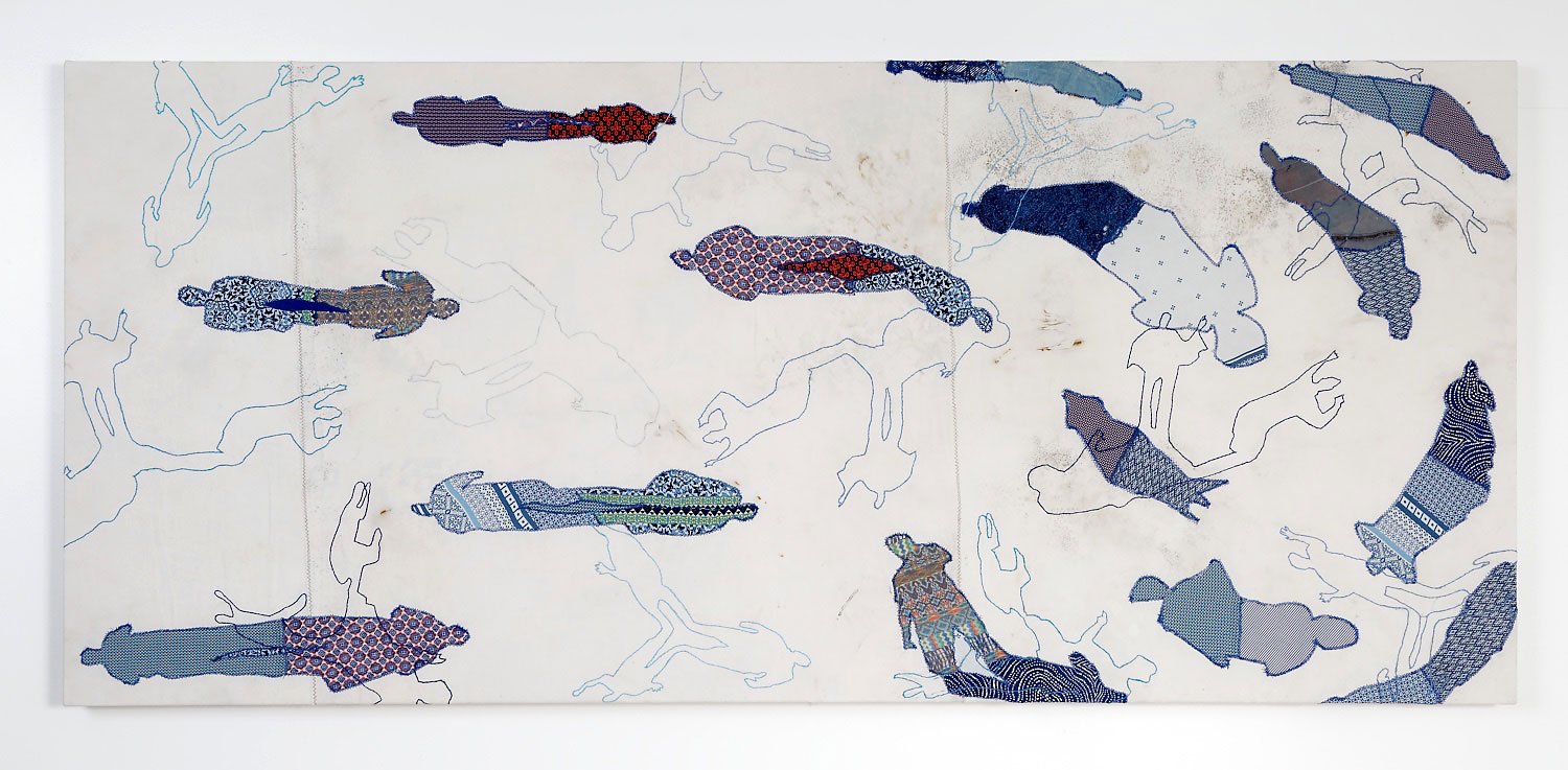 La crise des migrants, qui fait l’actualité mondiale depuis 2015, a ravivé mon intérêt pour les lignes de contours et les concepts frontaliers. Je m’interroge sur les notions de territoire géographique et corporel (naturel, culturel, construit), les notions de frontière, de limite et d’identité. J’ai utilisé le motif de l’ombre humaine : elle encadre un espace que nous n’occupons pas mais où notre présence est signalée.