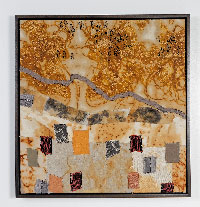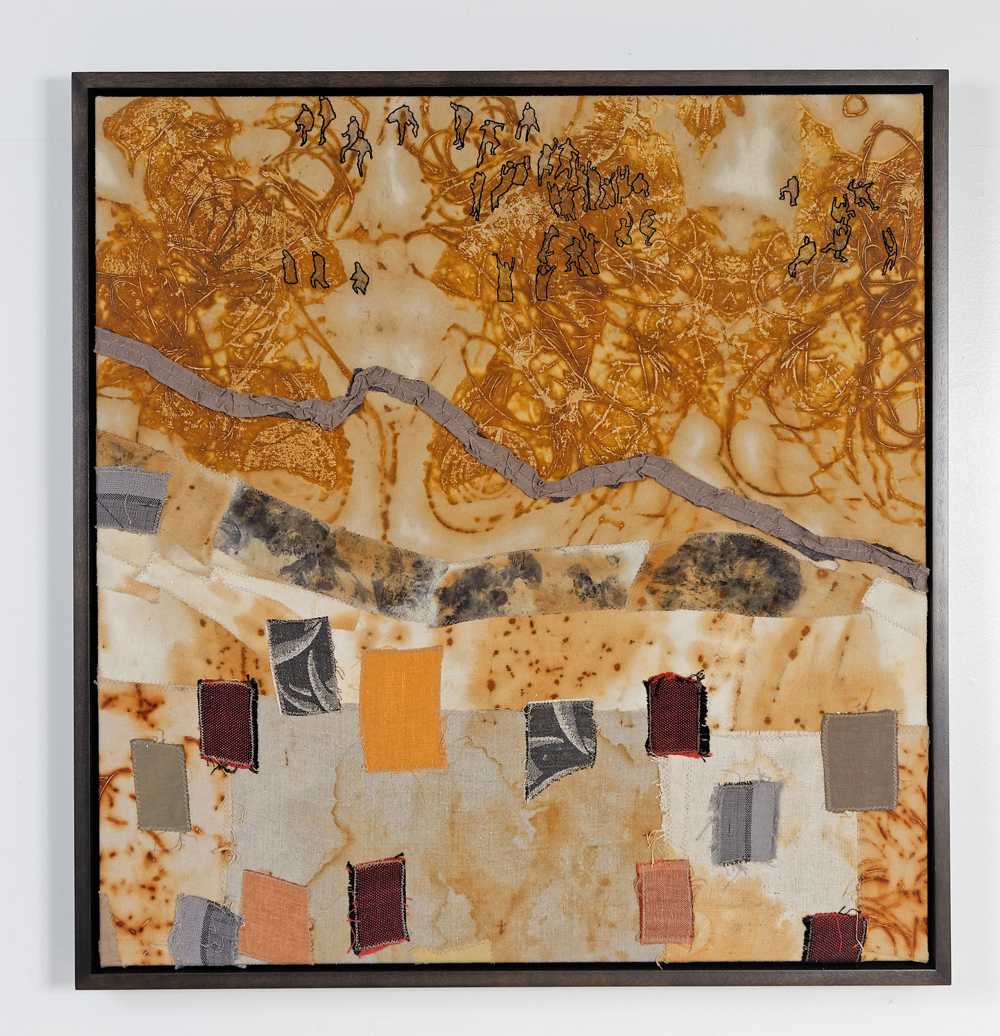 Lin et autres tissus, impressions de métal et botanique, aquarelle, couture, broderie